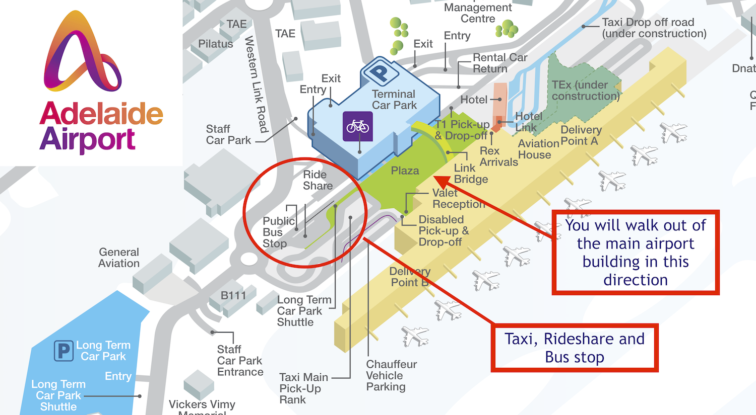 When you exit the airport, either walk straight across the plaza to the road (if someone is picking you up), or, for all other transport walk across the plaza to the left of the main carpark building - this includes buses, taxis or rideshare services. A map can be seen below or downloaded here.