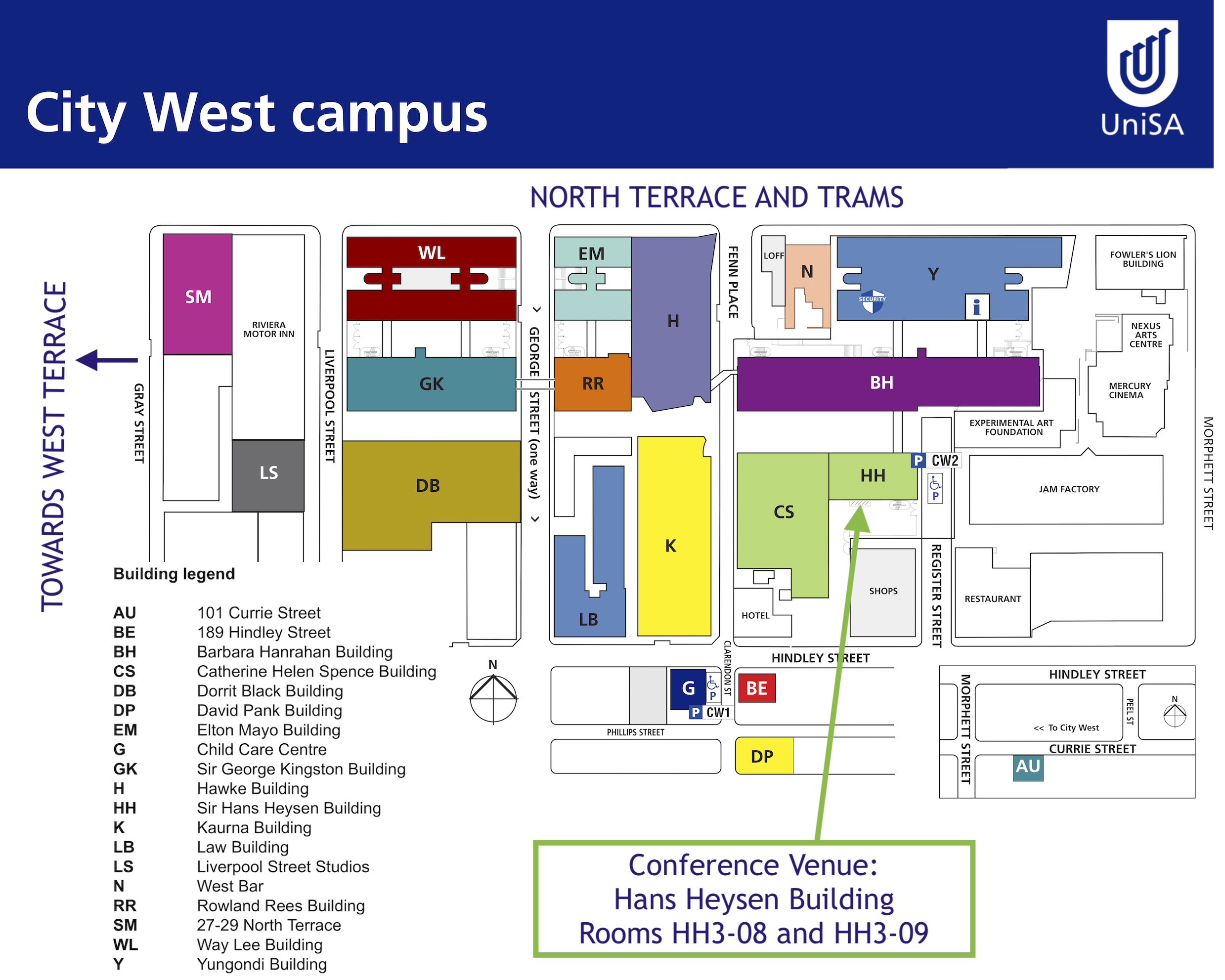 The conference will be held at the University of South Australia’s City West campus. We will be based in rooms HH3-08 and HH3-09 of the Sir Hans Heysen Building (Google Maps). The campus map can be seen below or a pdf downloaded here.