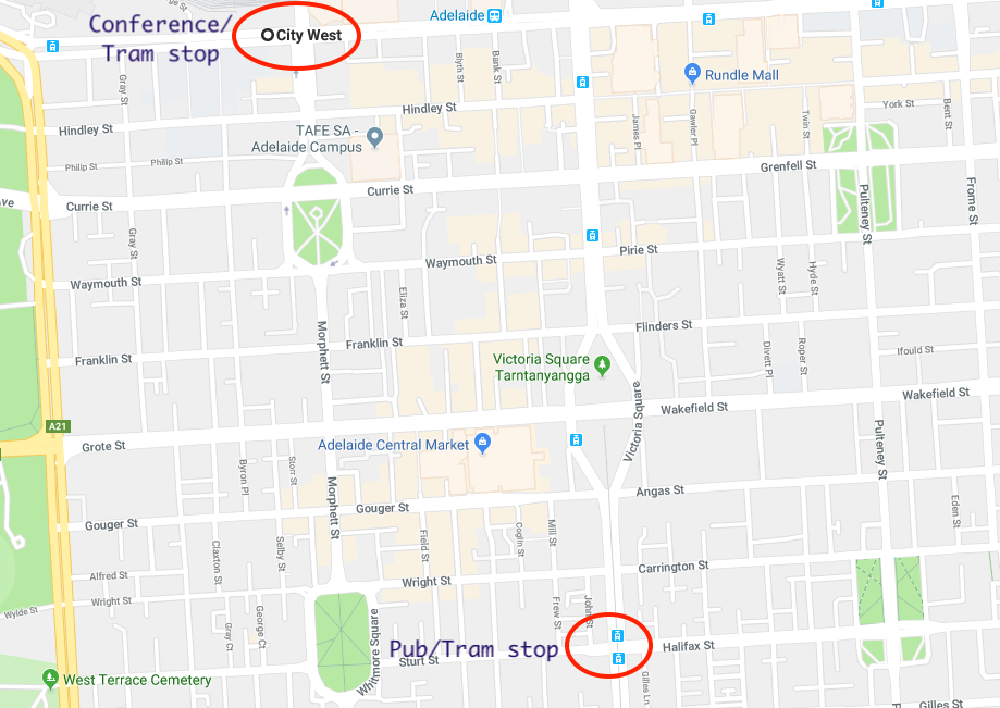 The conference dinner will be at the King's Head Pub, on the corner of King William and Sturt St. It is a 20-25 minute walk or you can take a 10 minute tram trip from the City West tram stop to the City South stop to go virtually door to door.